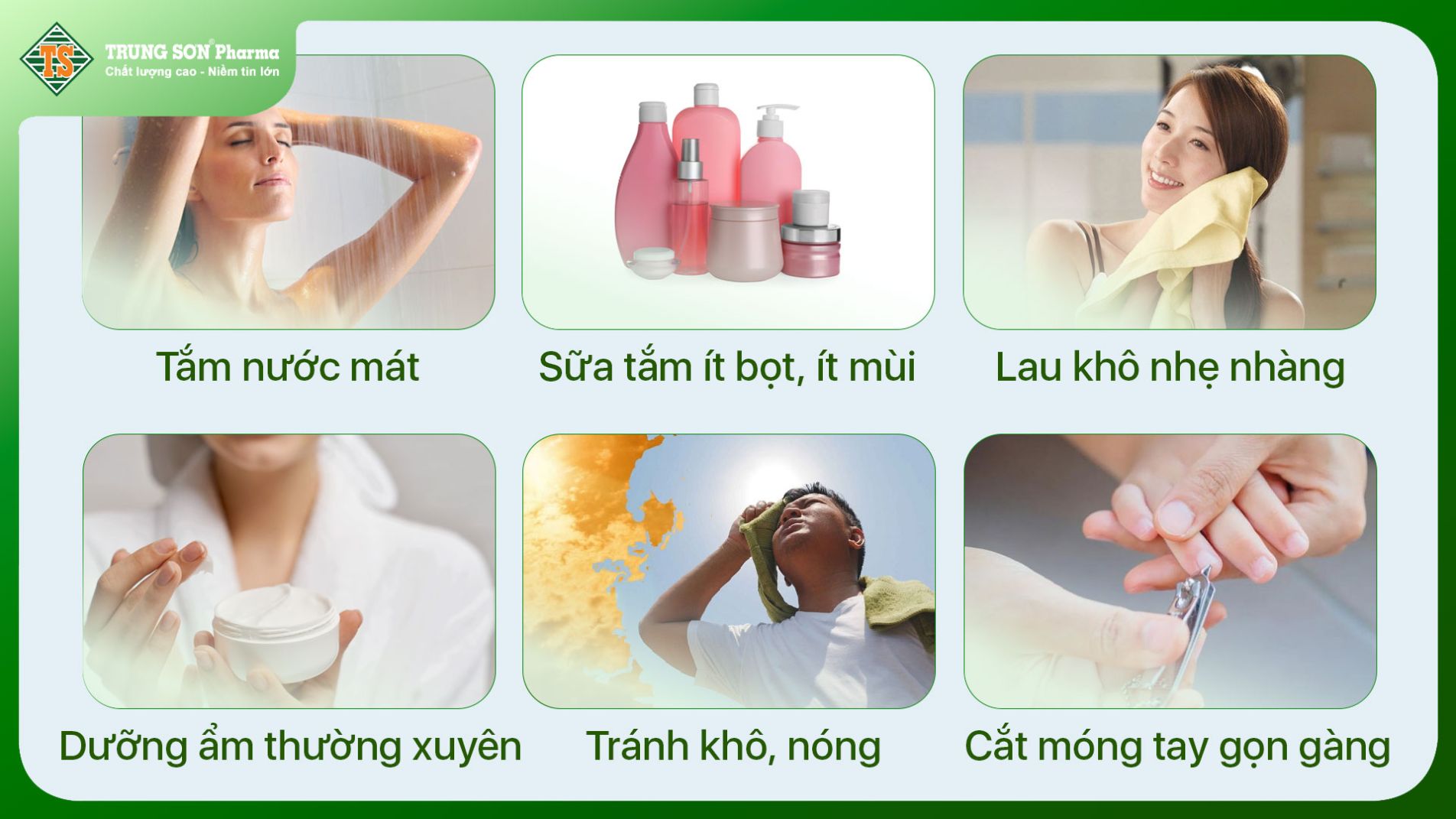 - Giữ da ẩm: Dưỡng ẩm ngay sau tắm, dùng kem dưỡng lành tính.