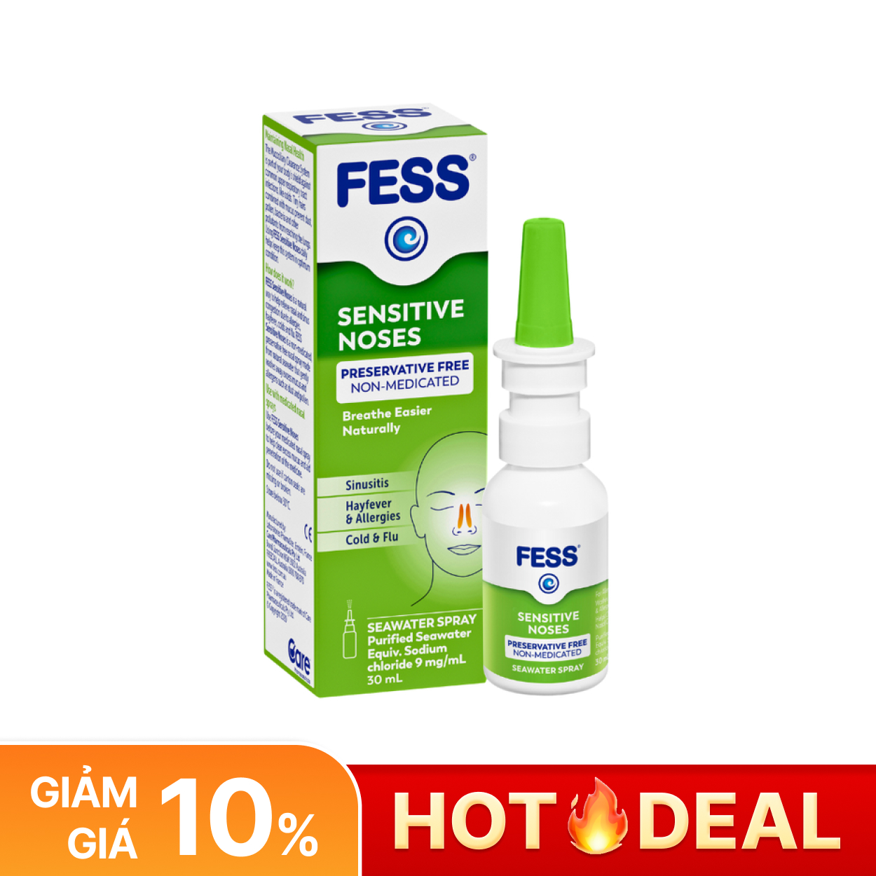 - Fess Sensitive Noses Spray là nước muối biển sâu dịu nhẹ giúp hỗ trợ làm sạch bụi bẩn, dị nguyên và loại bỏ dịch nhầy cho mũi nhạy cảm.