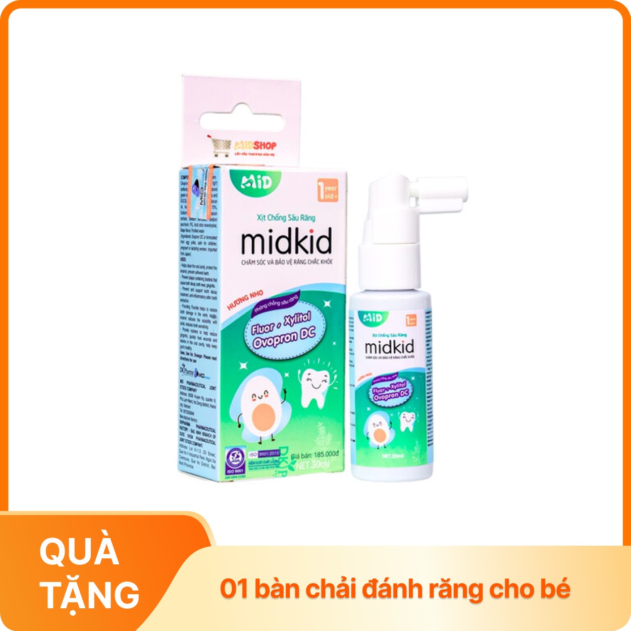 Xịt răng miệng midkid là giải pháp ngăn ngừa sâu răng tiện lợi và hiệu quả, được nghiên cứu riêng cho trẻ nhỏ. Sản phẩm có hai lựa chọn hương vị thân thiện: hương nho (30ml, màu xanh) và hương táo (20ml, màu đỏ)
