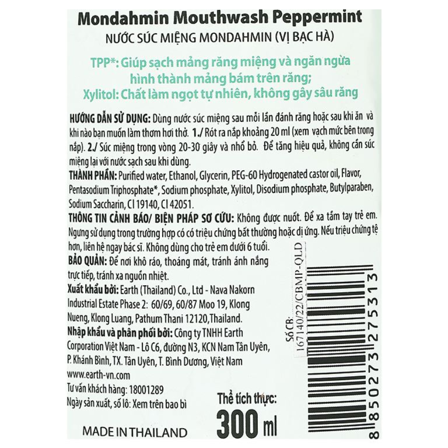 Nước súc miệng Mondahmin Pepper Mint 300ml có thành phần