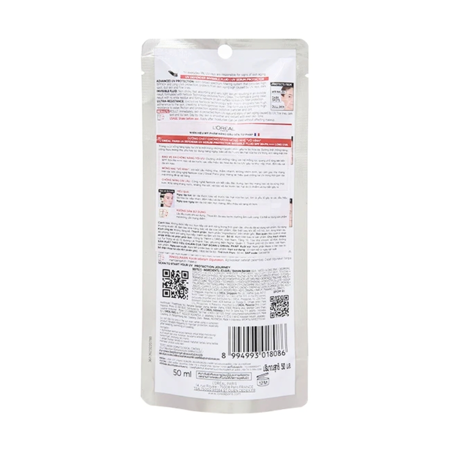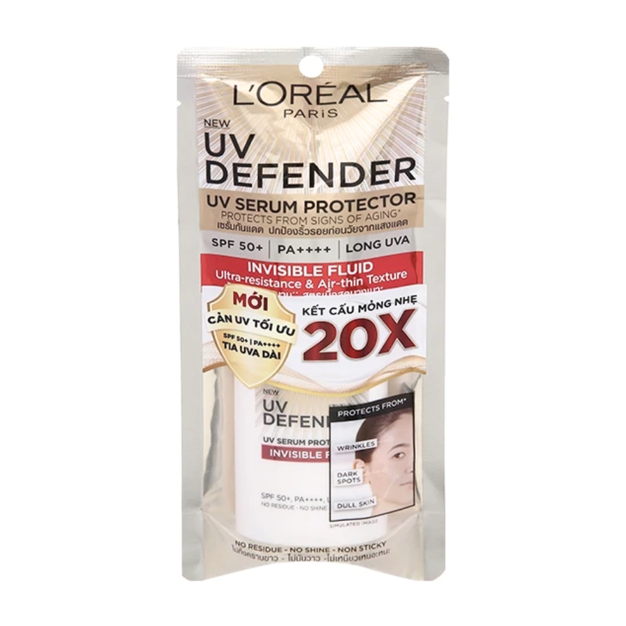 Kem Chống Nắng L’Oreal Paris UV Defender Serum Invisible Resist SPF50+ PA++++ x20 Mỏng Nhẹ sở hữu màng bảo vệ UV mạnh mẽ, giúp cản nắng tối đa nhưng vẫn nhẹ nhàng trên da. Với chỉ số chống nắng SPF50+ và khả năng chống lại tia UVA dài, sản phẩm giúp hỗ trợ bảo vệ da khỏi các dấu hiệu lão hoá do tia UV gây ra như: đốm nâu, da xỉn màu và nếp nhăn.