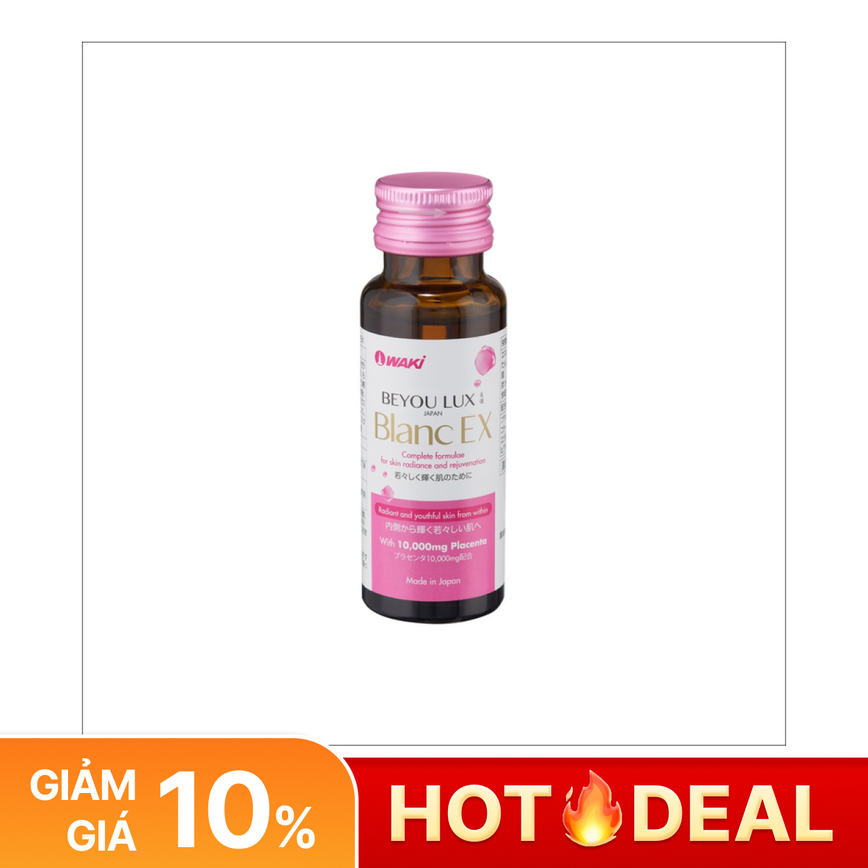 - Beyou Lux Blanc EX chứa collagen thủy phân và elastin kết hợp với nhau thai heo, giúp cải thiện độ săn chắc và tính đàn hồi của làn da, đồng thời mang lại vẻ đẹp sáng hồng tự nhiên. Để giảm thiểu mùi tanh của collagen và nhau thai heo, Waki đã chế biến sản phẩm dưới dạng nước với hương vị đào chua ngọt, dễ uống và dễ hấp thu.