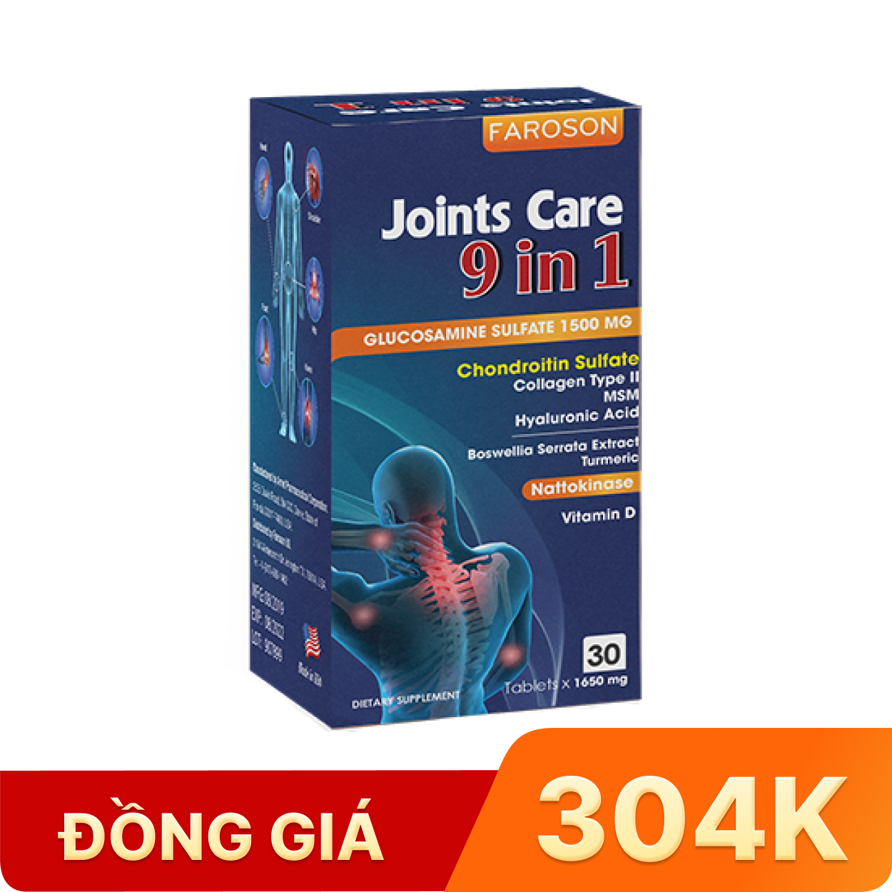 Faroson Joints Care - Sản phẩm bổ sung dưỡng chất cho khớp chứa glucosamine, chondroitin, collagen type II và các thành phần tự nhiên khác, giúp hỗ trợ giảm đau viêm khớp, thoái hóa khớp và cải thiện vận động linh hoạt. Đây là thực phẩm chức năng, không phải thuốc chữa bệnh.