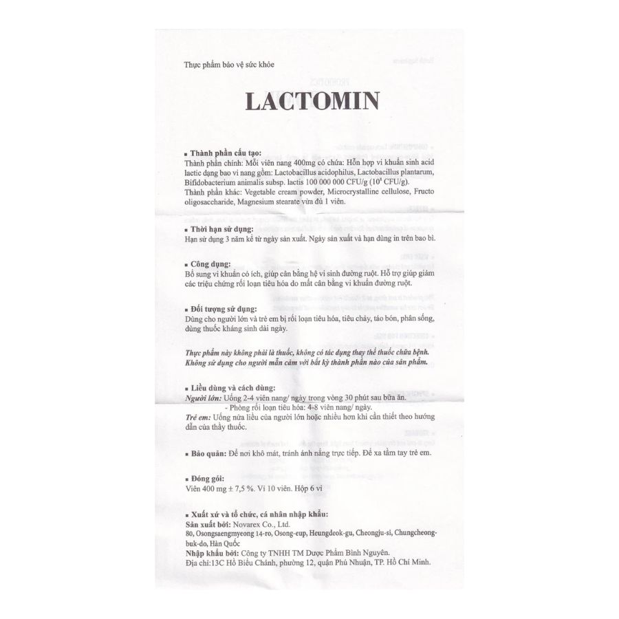 Lactomin được sản xuất với công nghệ hiện đại, chứa hỗn hợp vi khuẩn sinh axit lactic có lợi cho đường ruột. Sản phẩm dạng viên tiện lợi và dễ sử dụng.