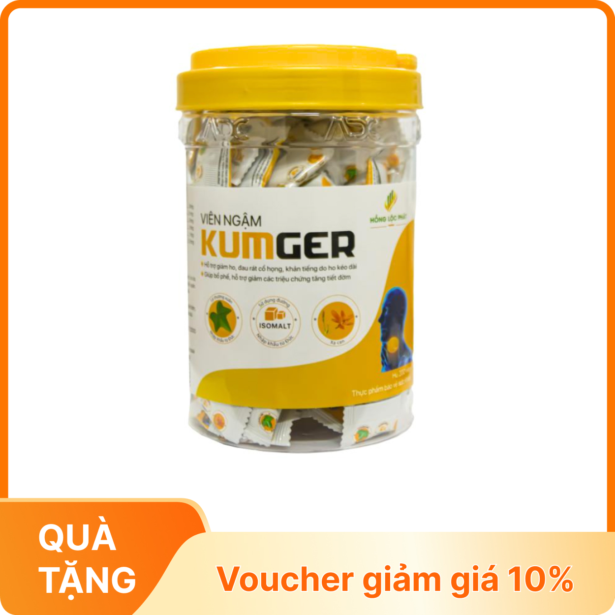 TPBVSK Viên ngậm Kumger loại hũ 200 viên được sản xuất đạt tiêu chuẩn GMP/ISO 22000. Sản phẩm được chiết xuất từ Cao lá thường xuân được nhập khẩu từ Tây Ban Nha và chiết xuất từ Xạ can, kết hợp với các loại tinh dầu: Tràm, húng chanh và gừng. Có tác dụng giúp bổ phế, hỗ trợ giảm các triệu chứng tăng tiết đờm, ho nhiều, đau rát cổ họng và khản tiếng do ho kéo dài.