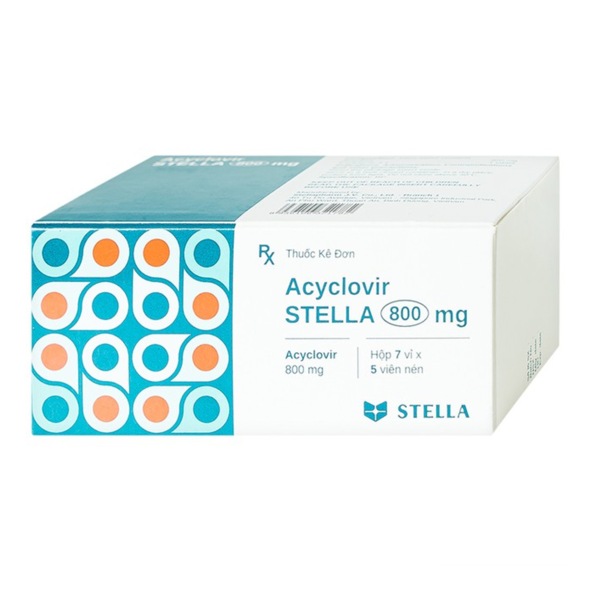 Acyclovir Stella 800mg là thuốc kháng virus hiệu quả, được sử dụng rộng rãi trong điều trị các nhiễm trùng do virus Herpes simplex loại 1 và 2, Herpes zoster (bệnh zona) và Varicella (thủy đậu). Với thành phần chính Acyclovir ở liều 800mg mỗi viên, thuốc hoạt động bằng cách ức chế sự nhân lên của virus, giúp giảm nhanh triệu chứng như mụn nước, đau rát và ngăn ngừa tái phát ở bệnh nhân có hệ miễn dịch bình thường hoặc suy giảm.