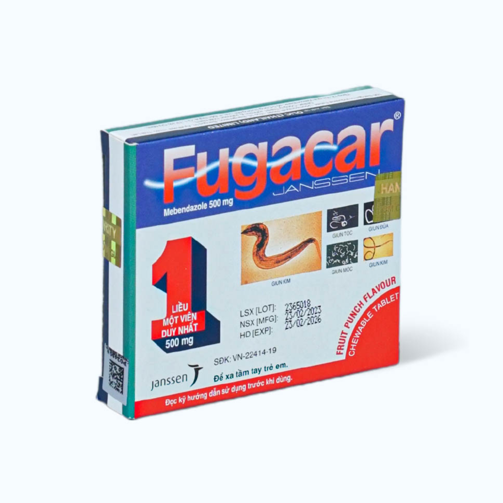 Sản phẩm được sản xuất bởi Janssen-Cilag (Thái Lan) thuộc tập đoàn Johnson & Johnson, có 2 hương vị dễ chịu: socola và trái cây nên đặc biệt phù hợp cho trẻ em từ 2 tuổi trở lên. Không cần nhịn ăn, không cần thuốc nhuận tràng, Fugacar được WHO khuyến cáo sử dụng trong các chương trình tẩy giun cộng đồng. Hộp 1 viên tiện lợi, dễ bảo quản, giá thành hợp lý – lựa chọn số 1 của các bà mẹ Việt khi con bị nhiễm giun.