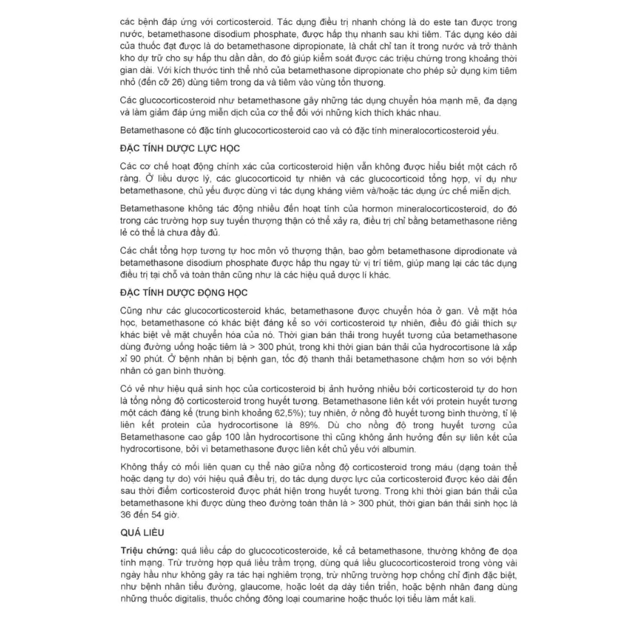 Thuốc chứa hai ester của betamethasone, trong đó betamethasone disodium phosphate có khả năng phân tán nhanh tại vị trí tiêm, nên có thể gây tác dụng toàn thân.